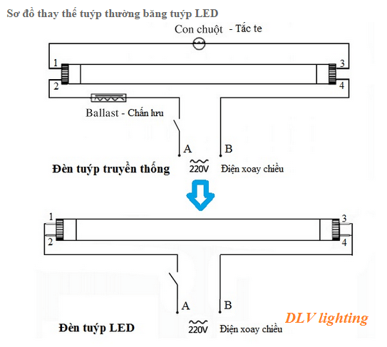 4. Tháo bỏ chấn lưu, đấu trực tiếp đầu ra và đầu vào của chấn lưu.